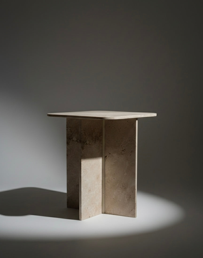 Son plateau carrer arrondie en travertin, lui confère une allure intemporel et naturelle.