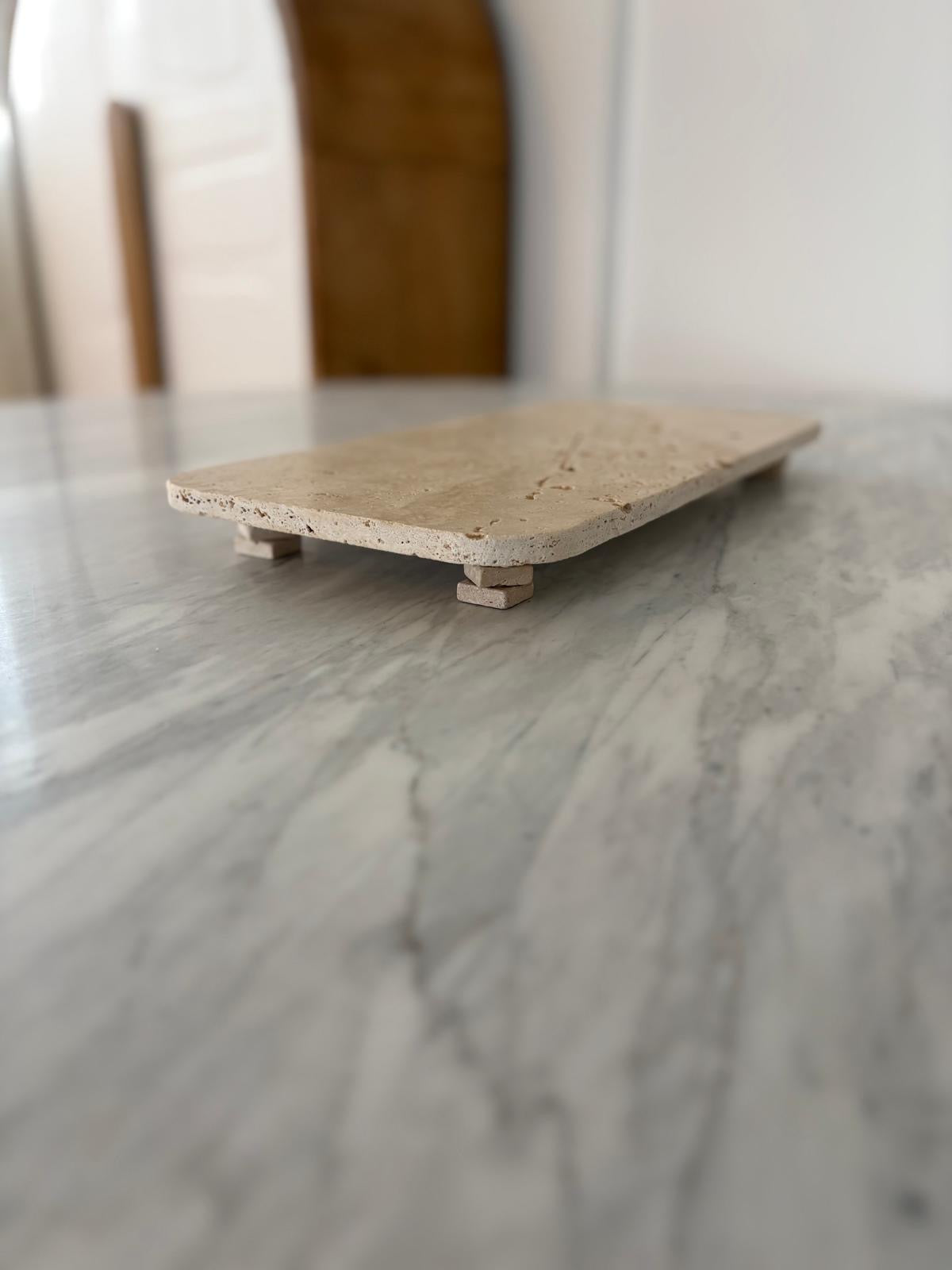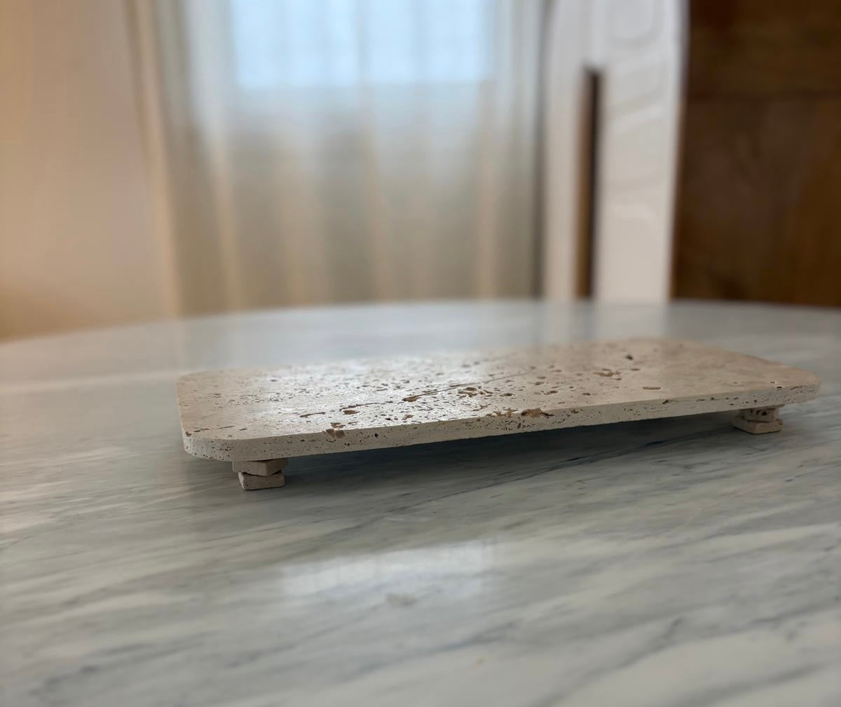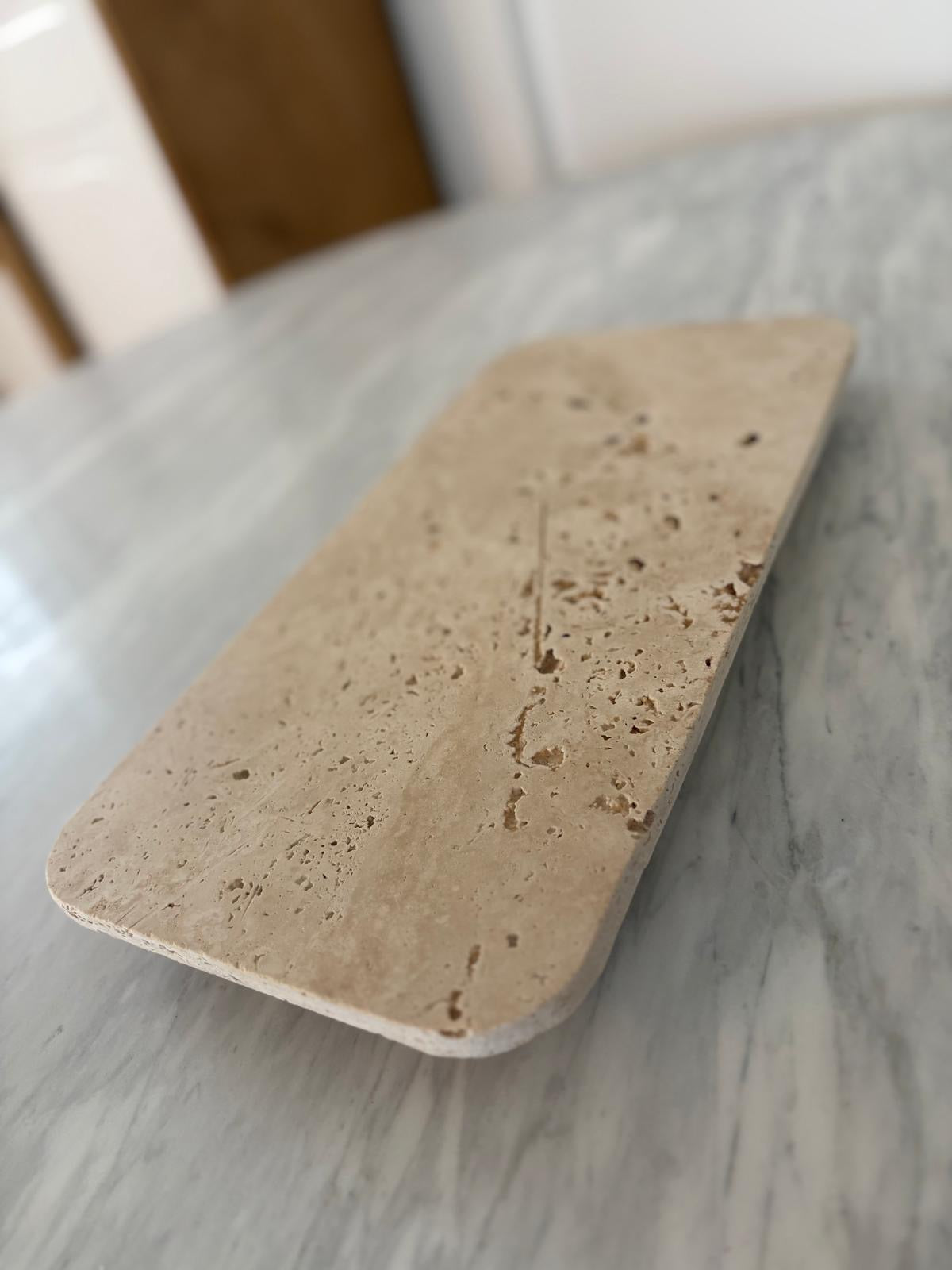 Ce plateau en travertin et le parfait, mélange d’élégance et de pratiques.