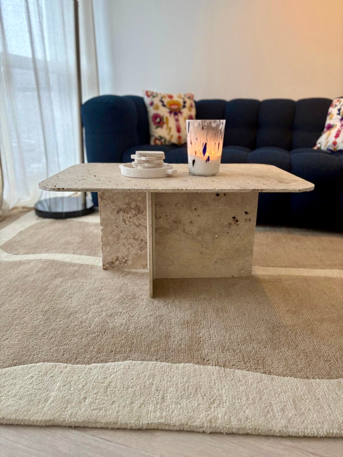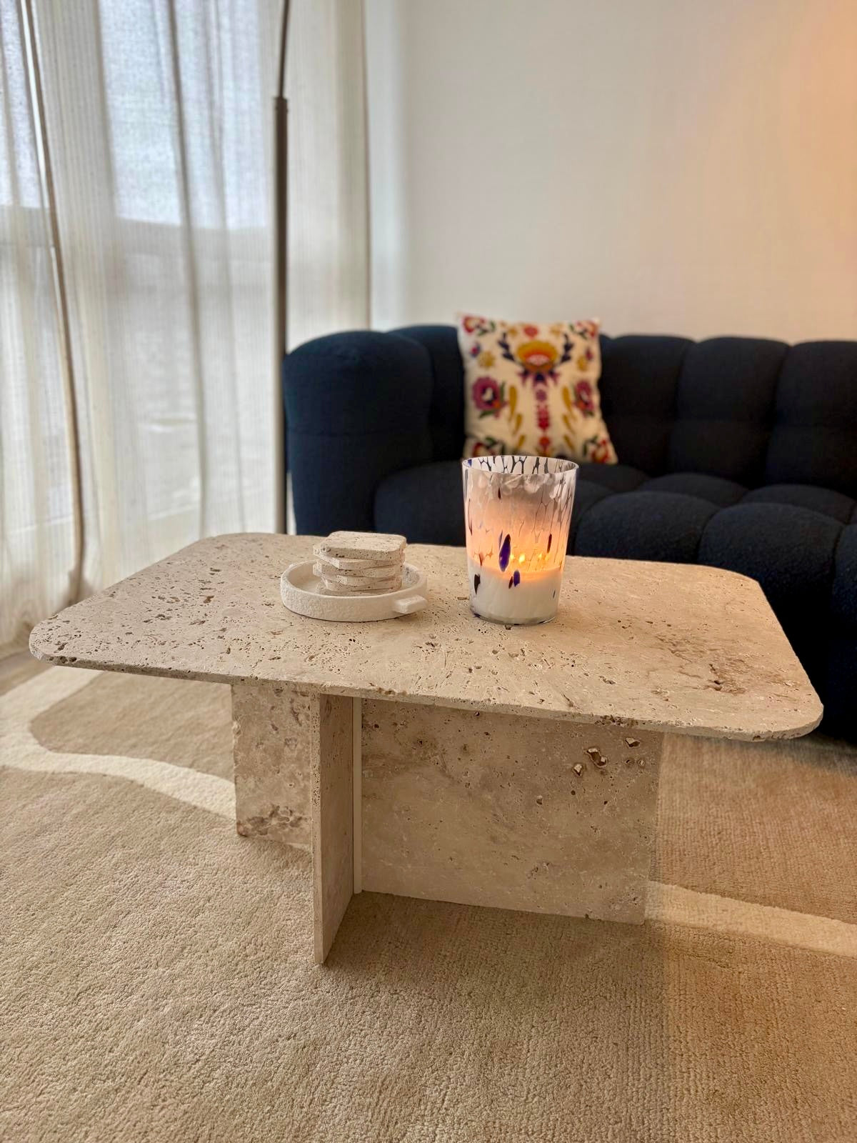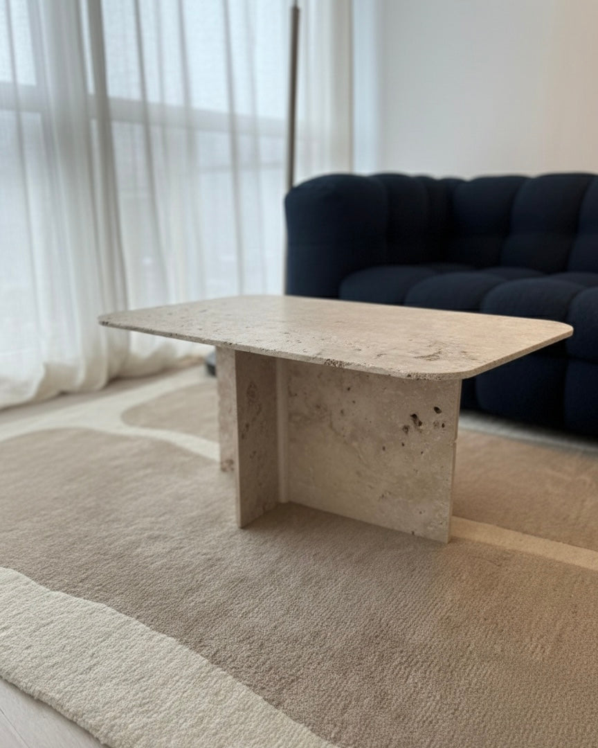 Plongée dans l’élégance avec cette table basse au plateau en travertin tailler avec précision dans une forme rectangle arrondi.