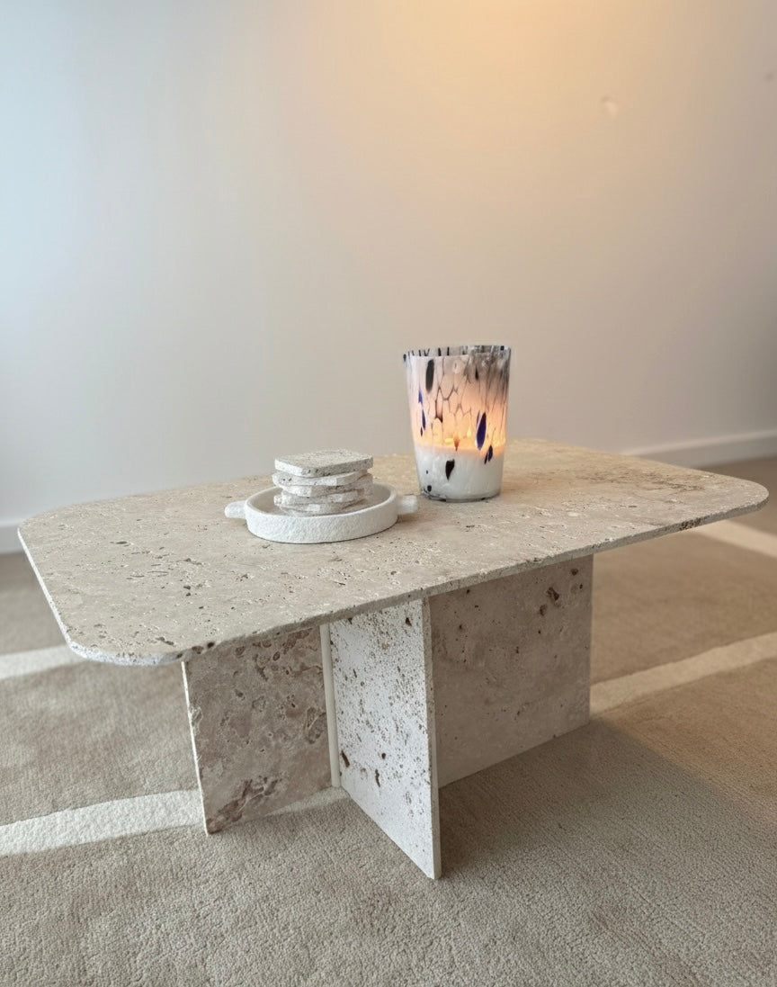 Son allure douce et saisissante, capte le regard, les pieds en travertin, parfaitement équilibré, ajoute une touche de majesté, tandis que les trois plaques centré crée un une symétrie subtile.