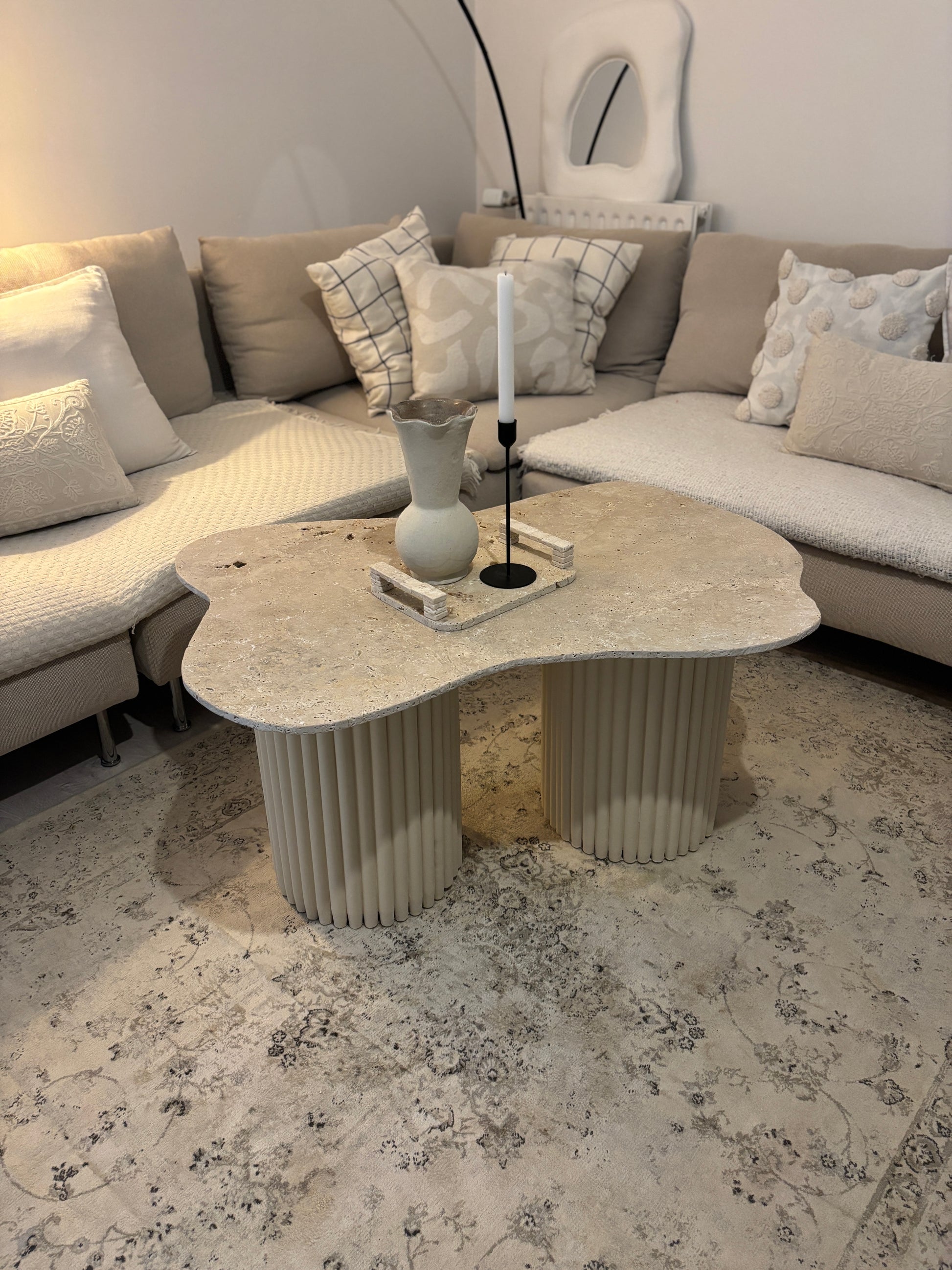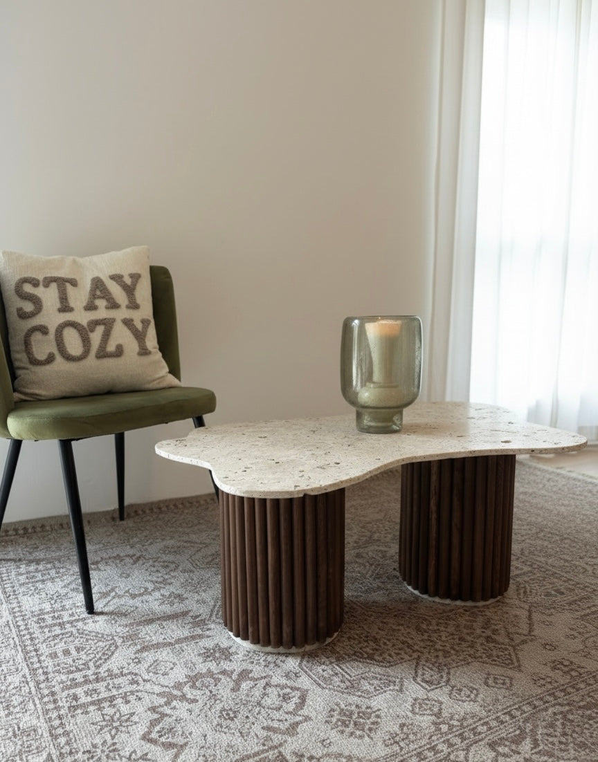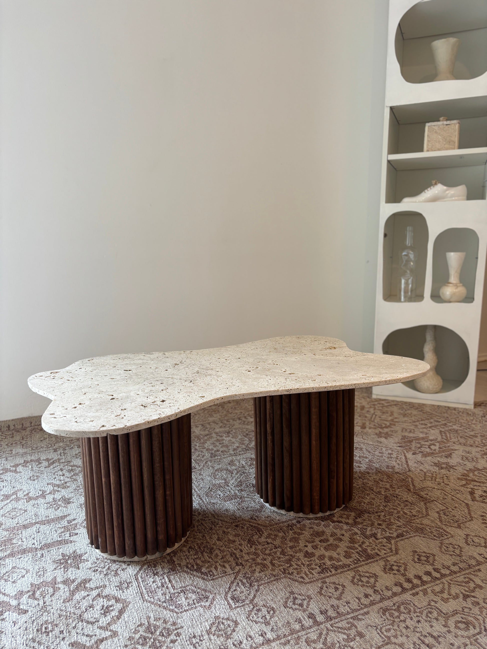 Son plateau en travertin, véritable sublimé par des formes organiques, repose sur des pieds en bois, côtelé d’une élégance naturelle, cette pièce, inspire, chaleur et douceur, apportant une touche apaisante à chaque intérieur.